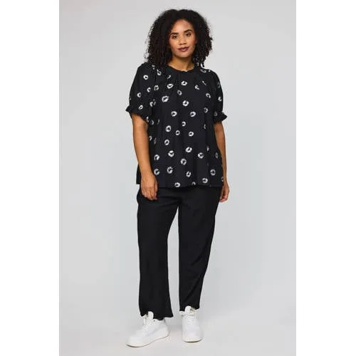 Deze zwarte dames top met pofmouwen van STUDIO is een fijne basis voor je garderobe als je houdt van vrouwelijk en comfortabel. De top heeft een ronde hals en korte mouwen met subtiele pof, waardoor je schouders mooi uitkomen zonder dat het overdreven oogt. De zwarte kleur vormt een rustige basis voor de bloemprint, die voor een zachte, vrouwelijke uitstraling zorgt.Details die het verschil maken Gemaakt van 83% viscose en 17% nylon, met een soepele stof die prettig aanvoelt op de huid Korte pofmouwen geven extra volume aan de schouders voor een elegant silhouet Ronde hals, makkelijk te combineren met een ketting of sjaaltje Zwarte basis met bloemendessin voor een rustige, maar toch opvallende look Onderdeel van het grote maten assortiment, met aandacht voor pasvorm en ruimte Geen zakken, waardoor de top mooi glad langs het bovenlichaam valtVrouwelijke top voor elke dagDeze top past goed bij een zwarte broek voor een rustige outfit, maar combineert ook mooi met een lichte jeans voor een meer casual look. Ideaal voor het voorjaar door de korte mouw en luchtige stof, en makkelijk te dragen naar werk, etentje of een dagje uit.STUDIO: modieuze styles met aandacht voor pasvormSTUDIO richt zich op moderne, vrouwelijke kleding met een pasvorm waarin je je vrij kunt bewegen. De collecties sluiten aan op de laatste trends, maar blijven draagbaar voor elke dag. Je kiest voor een merk dat comfort, stijl en een doordachte snit belangrijk vindt, zodat jij je prettig voelt in wat je draagt.Een veelzijdige top die je eenvoudig steeds weer anders combineert.