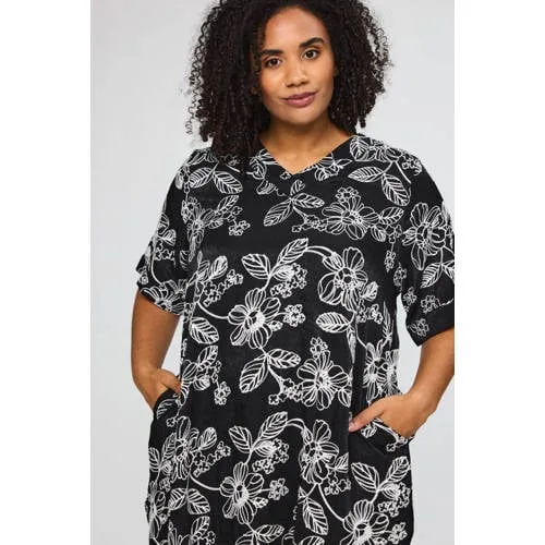Deze zwart-witte tuniek van STUDIO is een praktische basis voor dagen waarop je iets luchtigs met een zachte uitstraling wilt dragen. De bloemprint in rustige tinten zorgt voor een lichte printvariatie, terwijl de rechte pasvorm recht langs je lichaam valt. De korte mouwen en V-hals geven een open, lichte uitstraling, geschikt voor het voorjaar of een zachte zomerdag.Details die het verschil maken Zwart-witte bloemprint die eenvoudig te combineren is met een zwarte broek of jeans V-hals die extra accent legt op het halsgebied Korte, rechte mouwen voor luchtig draagcomfort Rechte pasvorm, prettig voor grote maten en fijn om over een smalle broek te dragen Zachte stof met viscose die soepel langs je lichaam valt Geen sluiting, je trekt de tuniek eenvoudig over je hoofd aan Geen zakken voor een gladde, rustige look aan de voorkantMakkelijk te stylen in het dagelijks levenDeze tuniek past goed bij een aansluitende broek of legging en kan zowel met sneakers als met sandalen worden gedragen. Voor werk, een etentje of een dagje shoppen, de tuniek zorgt snel voor een complete outfit met een rustige uitstraling.STUDIO: stijl voor grote matenSTUDIO richt zich op eigentijdse mode in grote maten, met aandacht voor pasvorm en comfort. De ontwerpen sluiten aan bij de nieuwste trends, maar blijven prettig in het dagelijkse gebruik. Zo combineert STUDIO een zachte uitstraling met praktische details waar je iedere dag plezier van hebt.Een rustige basis met bloemendessin die je garderobe veelzijdiger maakt.