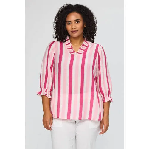Deze roze dames top met driekwart mouw van STUDIO is een luchtige basic met een vrouwelijke uitstraling. De top heeft een subtiele streep, een mooie V-hals en rechte mouwen tot net onder de elleboog. Ideaal voor de lente, wanneer je iets lichts en toch bedekkends zoekt. Door de pasvorm voor grote maten sluit de top prettig aan zonder te knellen.Verfijnde details voor elke dag Gemaakt van 83% viscose en 17% nylon, een soepele stof die prettig aanvoelt op de huid Driekwart mouwen met rechte snit voor een ontspannen en toch verzorgde look V-hals die het decolleté mooi uit laat komen zonder diep te vallen Streepprint in roze tinten voor een frisse, vrouwelijke uitstraling Speciaal ontworpen voor grote maten, met aandacht voor comfort en ruimteComfortabele top voor lente-outfitsDeze top is een fijne basis voor dagelijks gebruik in het voorjaar. Combineer met een donkere broek voor een rustige look of met een lichte jeans voor een meer casual uitstraling. De soepele stof valt mooi langs het lichaam en beweegt gemakkelijk met je mee tijdens een drukke dag.STUDIO: stijlvolle mode in grote matenSTUDIO richt zich op mode in grote maten met een vrouwelijke en moderne uitstraling. De ontwerpen volgen de seizoenen en sluiten aan bij actuele trends, terwijl het draagcomfort centraal blijft staan. Zo kies je voor kleding die goed voelt en er verzorgd uitziet.Een veelzijdige top die je garderobe op een subtiele, vrouwelijke manier uitbreidt.
