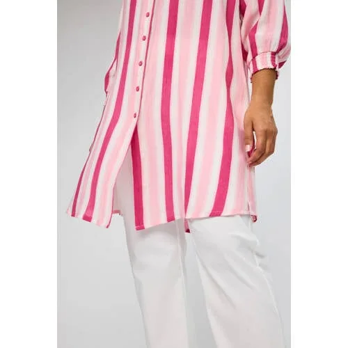 Deze gestreepte tuniek voor dames van STUDIO geeft je outfit direct een frisse uitstraling. De roze kleur met subtiele strepen zorgt voor een zachte, rustige look, terwijl de klassieke kraag en knoopsluiting een nette touch toevoegen. De tuniek valt soepel langs het lichaam en is gemaakt van 83% viscose en 17% nylon, waardoor het materiaal zacht aanvoelt en prettig om het lijf valt. Handig op dagen waarop je iets luchtigs en comfortabels wilt dragen.Details die het verschil maken Roze tuniek met streepprint voor een frisse, stijlvolle look Gemaakt van 83% viscose en 17% nylon voor een soepele, zachte touch Driekwart mouwen met rechte mouwinzet, ideaal tussen de seizoenen door Klassieke kraag en knoopsluiting voor een verzorgde uitstraling Ontworpen binnen het grote maten assortiment voor een comfortabele pasvorm Geen zakken, waardoor de tuniek mooi glad langs het lichaam valtComfortabele tuniek voor het lentegevoelDeze tuniek past goed bij het lenteseizoen. Draag het losjes over een smalle broek of legging voor een ontspannen silhouet. De driekwart mouwen geven net wat extra lucht, terwijl je toch bedekt blijft. Geschikt voor een dag op kantoor, een etentje of een casual weekendmoment.STUDIO: eigentijdse mode met een vrouwelijke touchSTUDIO richt zich op modieuze kleding met een vrouwelijke uitstraling en een comfortabele pasvorm. De ontwerpen sluiten aan bij de actuele trends en zijn tegelijkertijd makkelijk te combineren in het dagelijks leven. Zo vul je je garderobe met items die je vaak draagt en eenvoudig afwisselt.Een veelzijdige tuniek die je garderobe praktisch en stijlvol aanvult.