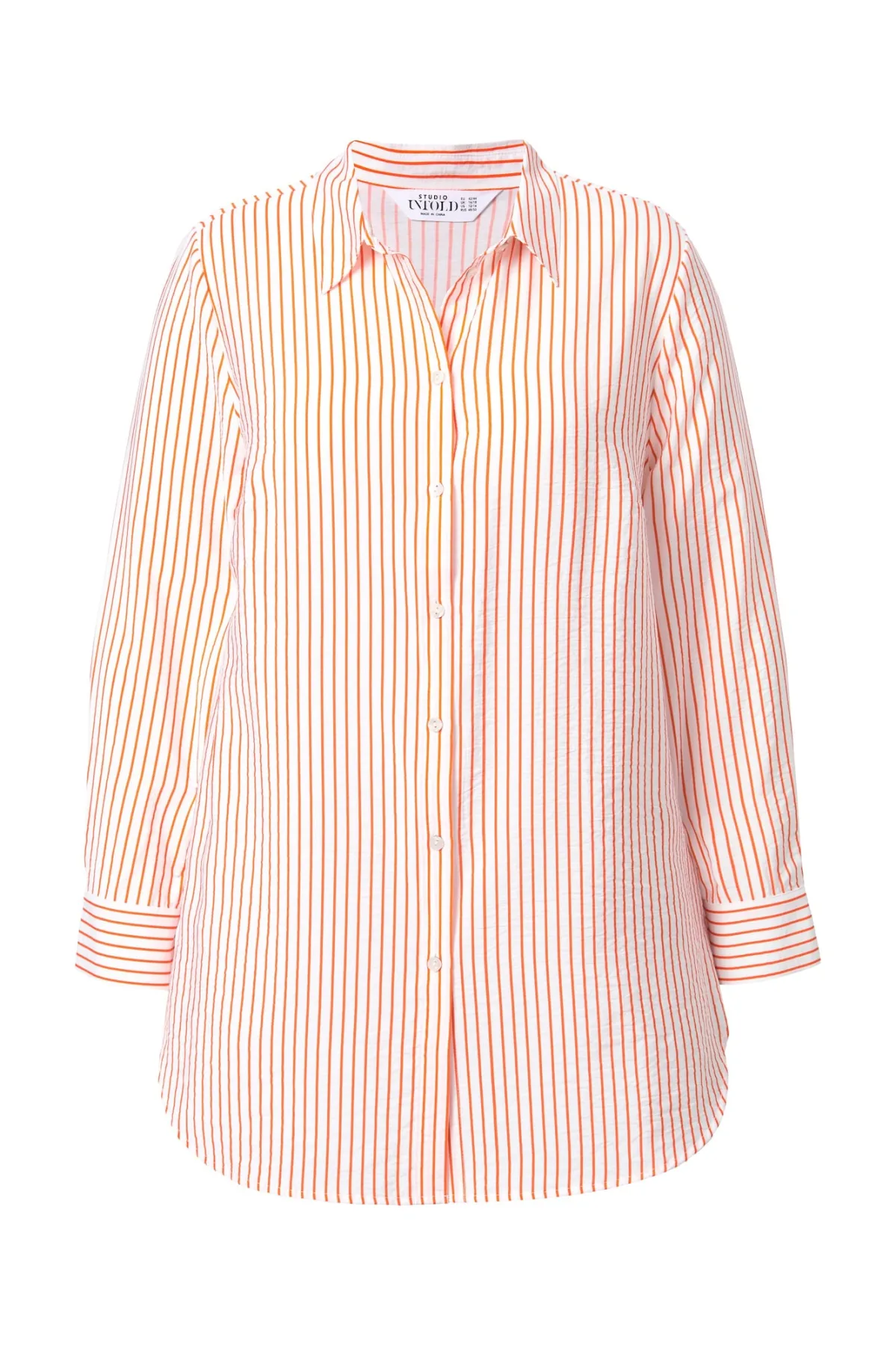Blouse type: Klassieke blouse; Design: Ronde zoom; Type sluiting: Knoopsluiting; Materiaal: Viscose; Motief: Gestreept; Kraag: Kentkraag; Extra's: All-over patroon; Pasvorm: Losse pasvorm; Armlengte: Lange mouw; Lengte: Lange pasvorm