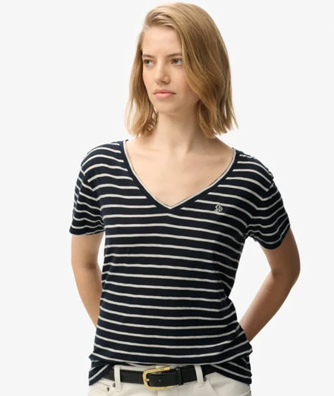 Specificaties: * Pasvorm: relaxed fit; V-hals * Kleur: donkerblauw - wit * Materiaal: 60% katoen - 40% lyocell