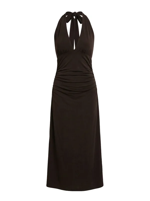 Design: Gevoerde zoom/rand, Diepe snit/decolleté, Om te knopen/binden; Materiaal: Jersey; Halstype: V-hals; Motief: Effen; Soort bandjes: Haltermodel; Details: Gedrapeerd, Backless; Extra's: Op staal naden, Voelt zacht aan; Lengte: 7/8 lengte; Snit: Getailleerd; Pasvorm: Slanke pasvorm; Armlengte: Mouwloos