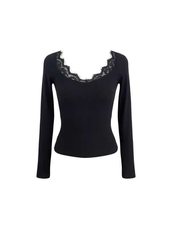 Design: Overige kragen, Ingelegde kraag; Materiaal: Jersey; Halstype: Ronde hals; Motief: Effen; Details: Kant; Extra's: Op staal naden, Voelt zacht aan; Pasvorm: Slanke pasvorm; Armlengte: Lange mouw; Lengte: Normale lengte