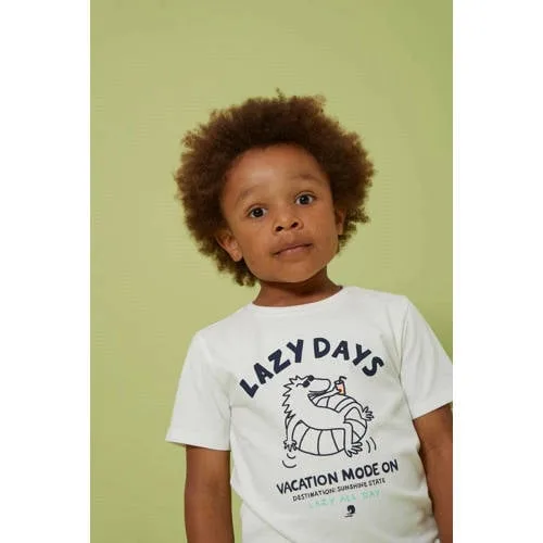 Voor een relaxte dag op school of een middag buitenspelen is dit wit jongens T-shirt van Sturdy een praktische basic. De korte mouwen en ronde hals geven een vertrouwde pasvorm, terwijl het zachte stretchkatoen soepel meebeweegt met elke sprong en draai. De Lagoon Legends printopdruk op de voorkant zorgt voor een speelse look die makkelijk te combineren is met jeans, shorts of een jogger.Comfortabel T-shirt voor elke dag Gemaakt van zacht stretchkatoen (96% katoen / 4% elastaan) dat prettig aanvoelt op de huid Korte mouwen en ronde hals voor een vertrouwde, comfortabele pasvorm Lagoon Legends printopdruk voor een stoere, speelse uitstraling Geen sluiting, het shirt trek je eenvoudig over het hoofd aan en uit Geschikt voor peuter en kleuter maten, ideaal voor actieve kinderen Wasbaar op 40 graden en lauw strijkbaar (1 punt) voor eenvoudig onderhoud Niet drogen in de droogtrommel, zo blijft de stof en print mooiPraktisch in het drukke kinderlevenDit Sturdy T-shirt past makkelijk in de dagelijkse routine. Na een wasbeurt op 40 graden hang je het simpelweg te drogen, waarna het weer klaar is voor een nieuwe dag vol spelen, ontdekken en bewegen. De stretchy stof geeft genoeg ruimte om vrij te bewegen, zowel binnen als buiten.Sturdy, gemaakt voor actieve kidsSturdy ontwerpt kinderkleding met oog voor draagcomfort en stoere details. De items zijn afgestemd op het actieve leven van kinderen, met zachte materialen en praktische pasvormen.Een T-shirt dat goed aansluit bij alle avonturen van alledag.