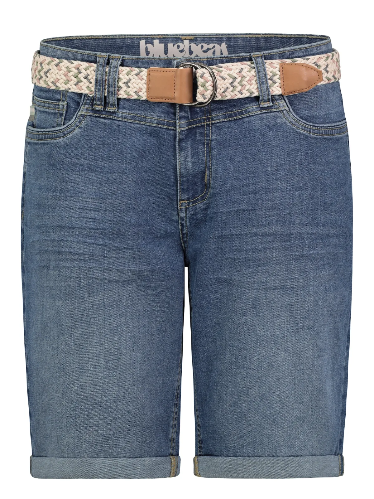 Design: Omgeslagen zoom, Ritssluiting, 5-pocket-style, Met riem; Type sluiting: Ritssluiting; Materiaal: Denim; Motief: Effen; Extra's: Contrasterende naden, Gewassen effect, Vaste grip, Riemlussen; Wassing: Blauw denim; Lengte: Knielengte; Pasvorm: Regular; Taillehoogte: Mid waist