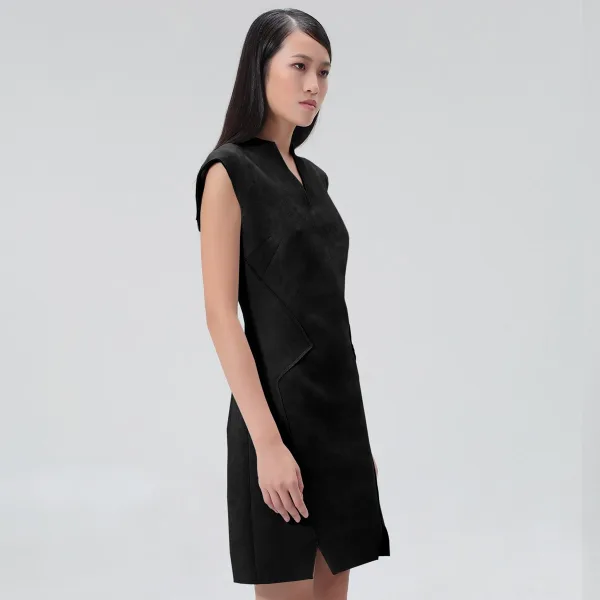 Deze op maat gemaakte jurk is een geweldige keuze om een voorsprong te brengen in een formele garderobe. Het past perfect bij zowel het kantoor als de speciale gelegenheden. Het originele snijden wordt aan de voorkant verbeterd met geometrische lijnen die uw silhouet subtiel markeren. De stof is een gladde en stretch suede, zeer comfortabel en toch stijlvol. Twee kleine spleten aan de voorkant, verborgen rits in de achterkant, gevoerde schouders. Productdetails: Vorm: gemonteerd, op maat gemaakt Lengte: 96 cm Mouwloos V -kraag Bevestigd met verborgen rits aan de zijkant