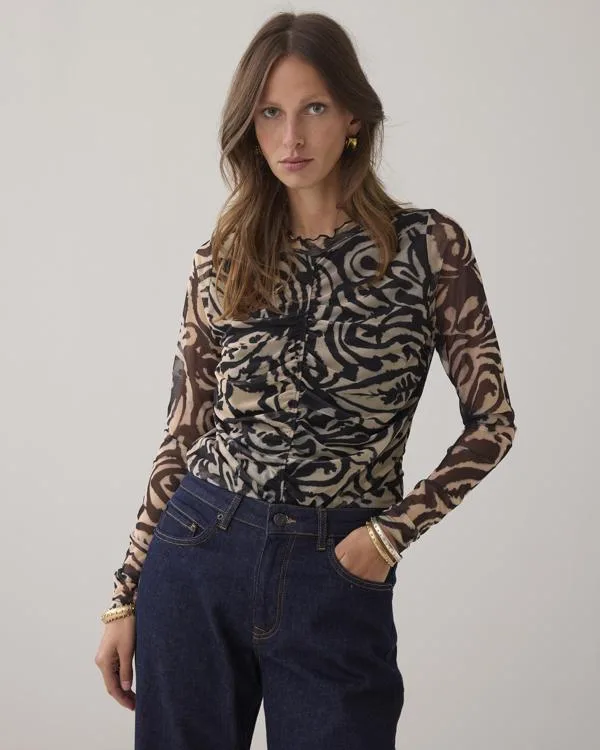 Deze top van Summum heeft rechte mouwen en een ronde hals. De top is gemaakt van mesh en heeft een all over print. Met plooien krijgt je outfit een extra detail.