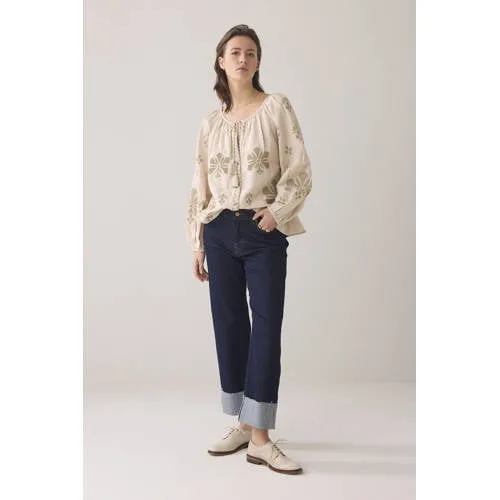 Summum Woman Long Sleeve Top Linen Heavy Embroidery Pebble Beige