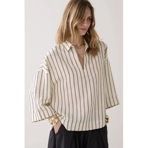 Deze Summum top voor dames is een lichte basic met een rustige streep die je gemakkelijk combineert. De crème met zwarte strepen zorgt voor een luchtige uitstraling, passend bij het voorjaar. De stof voelt soepel aan en valt mooi om het lichaam, waardoor de top geschikt is voor drukke werkdagen en ontspannen momenten.Verfijnde details voor elke dag Kleurcombinatie crème/zwart met subtiele streep voor een rustige look Driekwart mouwen met rechte inzet, ideaal tussen de seizoenen door V-hals die de halslijn mooi laat uitkomen Gemaakt van een zachte, soepelvallende stof met modal voor extra draagcomfort Top zonder zakken voor een clean en gestroomlijnd silhouet Onderdeel van de Boutique collectie, passend bij een verzorgde, moderne stijlMakkelijk te stylen in het voorjaarDeze top is een praktische basis voor lente outfits. Combineer met een zwarte pantalon en loafers voor een verzorgde werklook, of draag de top met een lichte jeans en sneakers voor een casual dag. Door de driekwart mouwen is een extra vest of blazer vaak niet nodig, en een dun jasje erover geeft op koelere dagen net wat extra warmte.Summum, aandacht voor pasvorm en detailSummum staat bekend om kleding met een vrouwelijke pasvorm en oog voor detail. De collecties sluiten aan bij een moderne levensstijl, waarin je kleding zoekt die er verzorgd uitziet en tegelijkertijd comfortabel aanvoelt. Met deze top haal je een doordacht ontworpen item in huis dat zich makkelijk laat combineren.Een praktische, veelzijdige basis voor je garderobe waar je het hele seizoen plezier van hebt.