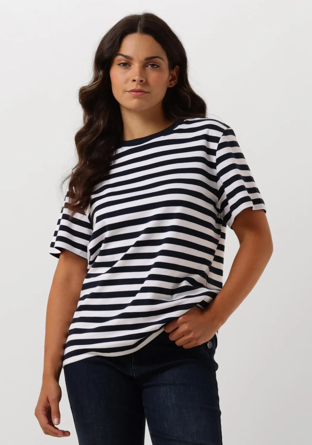 Stap stijlvol de dag in met de SHORT SLEEVE TOP CLASSIC COTTON TEE van SUMMUM. Deze blauw met wit gestreepte T-shirt, gemaakt van hoogwaardig katoen, biedt ultiem comfort en een tijdloze look. Perfect voor een casual dagje shoppen of een ontspannen lunch met vriendinnen. Combineer met een strakke jeans en een paar trendy sneakers voor een moeiteloze, chique uitstraling. Of draag onder een blazer voor een meer geklede look. Deze veelzijdige top is een must-have in elke damesgarderobe.