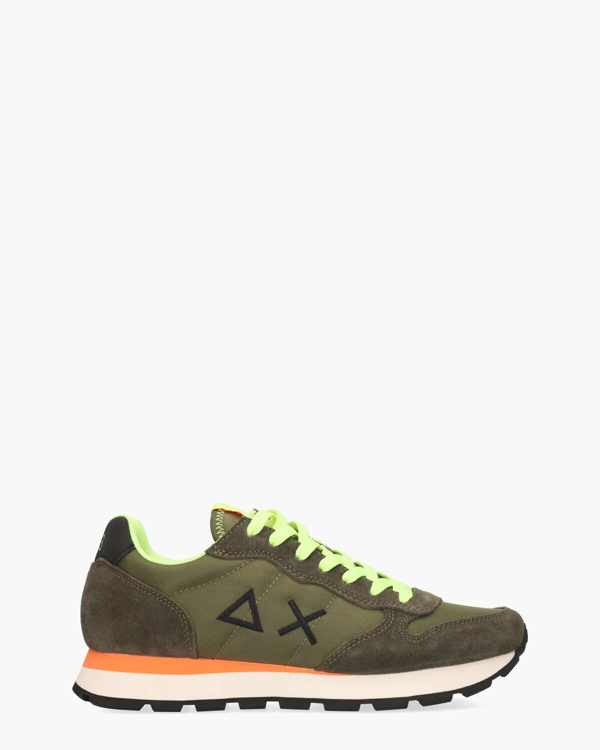 De Tom Fluo Z35102-19 herensneakers van het Italiaanse merk SUN68 combineren sportieve stijl met een opvallend design. De bovenzijde van nylon en suède in een legergroene tint zorgt voor een dynamische look. De groene mesh tong met fluo'Run Faster Than You Can Badge'en fluoriscerende afwerking vormt een stijlvol contrast, terwijl de