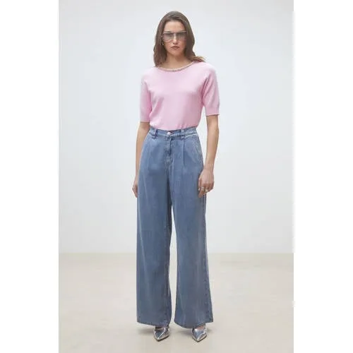 Maak je denimcollectie compleet met deze Suncoo wide leg jeans in light blue denim. De hoge taille en wijde pijpen geven een moderne, luchtige look die mooi aansluit op de heupen en vanaf het bovenbeen ruim uitloopt. De lichte wassing maakt de jeans ideaal voor het voorjaar en voor dagelijks gebruik.Denim met een moderne pasvorm Wide leg model met lange pijpen voor een relaxed en stijlvol silhouet Hoge taille die prettig aansluit en je middel optisch benadrukt Gemaakt van 90% katoen voor een stevige, toch soepele denimkwaliteit Rits- en knoopsluiting aan de voorkant voor een klassieke jeanslook Praktische 5-pocket styling met achterzakken en steekzakken voorop Voorzien van riemlussen zodat je eenvoudig je favoriete riem kunt toevoegen Effen light blue denim kleur, makkelijk te combineren met tops en blousesElke dag draagbaar, van casual tot gekleedDeze wide leg jeans draag je net zo makkelijk met sneakers en een T-shirt als met hakken en een nette blouse. De lichte kleur past goed bij zachte tinten, maar ook bij een donker vest of blazer. Dankzij de lange lengte vallen de pijpen mooi over je schoenen.Franse stijl van SuncooSuncoo is een Frans modemerk dat bekendstaat om eigentijdse en vrouwelijke collecties. De ontwerpen combineren draagbare pasvormen met subtiele details en actuele trends. Met een jeans van Suncoo haal je een betrouwbaar basisstuk in huis dat je garderobe seizoen na seizoen aanvult.Een veelzijdige denimfavoriet waar je het hele seizoen naar grijpt.