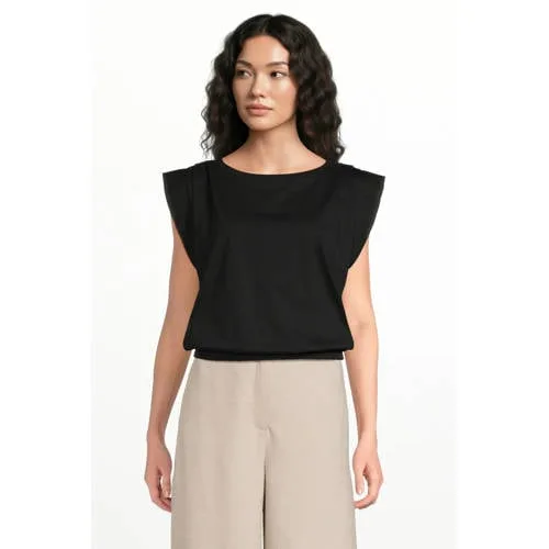 Deze zwarte katoenen dames top van Suncoo is een veelzijdige basic met een verfijnde uitstraling. De top is mouwloos, heeft een ronde hals en is uitgevoerd in een effen zwarte kleur. De elastische boord sluit mooi aan, waardoor het silhouet netjes en verzorgd oogt. Gemaakt van 100% katoen, voelt de stof zacht en comfortabel aan op de huid, ideaal voor het voorjaar en milde dagen.Details die het verschil maken Gemaakt van 100% katoen voor een zachte, ademende touch Mouwloos model, prettig op warmere dagen of onder een blazer Ronde hals voor een tijdloos en makkelijk te combineren design Effen zwarte kleur, eenvoudig te stylen in verschillende outfits Elastische boord voor een nette aansluiting in de taille Rechte schouddetails zonder zakken voor een rustige, cleane look Onderdeel van de Boutique collectie, met aandacht voor stijlvolle detailsVeelzijdig te combineren in jouw garderobeDeze top draag je net zo makkelijk op een jeans als in een rok met hoge taille. Onder een vest of blazer vormt hij een rustige basislaag, zonder dikke mouwen die knellen. In de lente kun je de top solo dragen met een luchtige broek en sneakers of sandalen.Suncoo als stijlvolle keuzeSuncoo staat bekend om moderne damesmode met aandacht voor nette afwerking en draagbare ontwerpen. De collecties zijn ontworpen voor vrouwen die houden van eigentijdse items die goed te combineren zijn met de rest van hun garderobe. Met deze top haal je een doordacht basisstuk in huis waar je veel kanten mee op kunt.Een subtiel, stijlvol element in je kledingkast waar je seizoen na seizoen plezier van hebt.