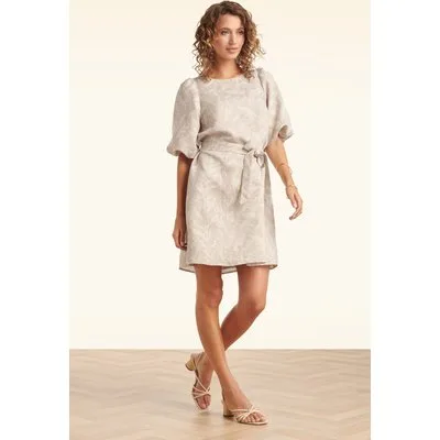 “Golden threads, daydream energy.” Deze zandkleurige a-lijn jurk met ballonmouwen is uitgevoerd in een stevige maar soepele, luchtige linnen-look stofmix voorzien van een goudkleurige shimmer. * Ronde halslijn * 1/2 ballon mouwen * Afneembaar striklint, voor een extra 'snatched' taille * Geen rits of knopen, aantrekken en 'ready to go' * Gevoerd * Reikt bij een lengte van 1,70 m tot boven de knie