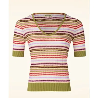 “Good vibes come in colorful stripes.” Deze vrolijke knitted cutie brengt instant happiness in je outfit! Ze heeft een flatterende V-halslijn, korte mouwen en een speels gestreept patroon in verschillende kleuren dat letterlijk elke look opfleurt. Uitgevoerd in een fijngebreide, zachte en soepelvallende katoen/- viscosemix die heerlijk comfortabel draagt. * V-halslijn * Korte mouwen * Lang genoeg om op een normale heupbroek te dragen