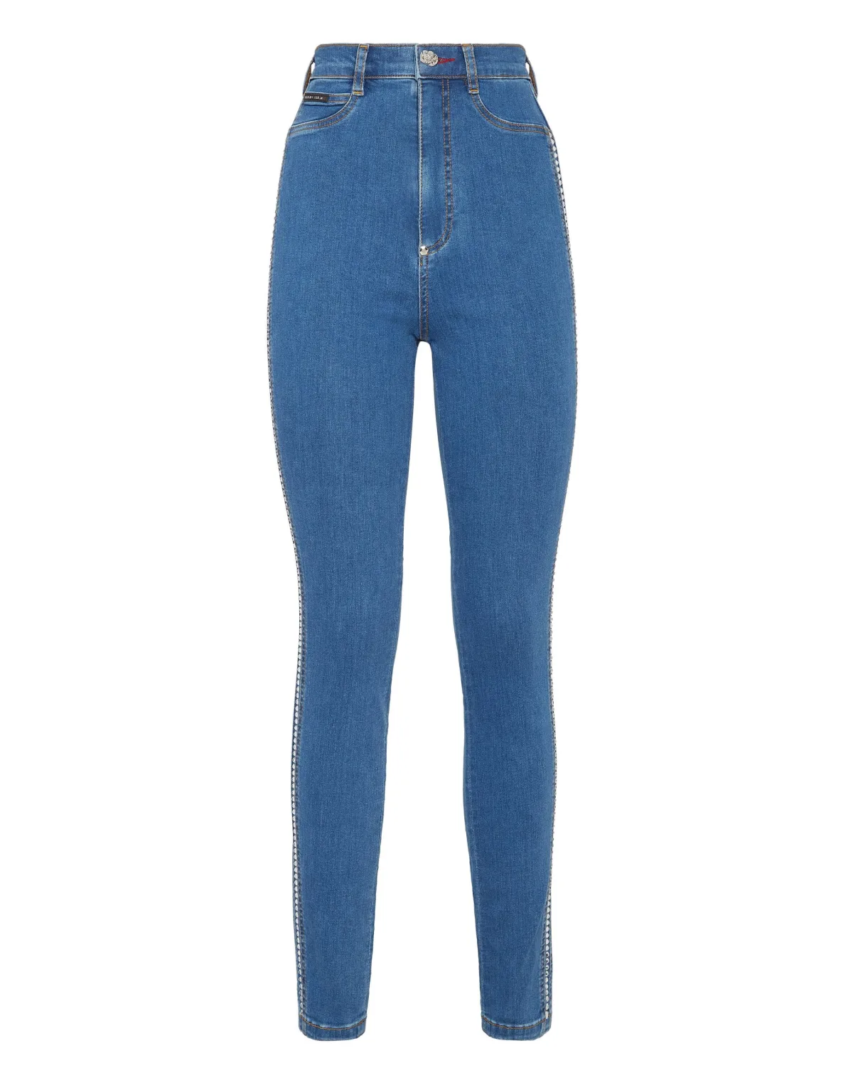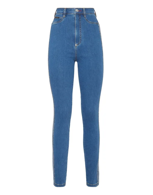 Verfraaid Stretch stone washed denim 5 pocket jeggings. Strass-applicaties versieren het kledingstuk. Enkele metalen knoopsluiting. Een badge met logo is genaaid onder de rechter achterzak. Onderkant: 28 cm. Pasvorm: Zeer hoge taille.