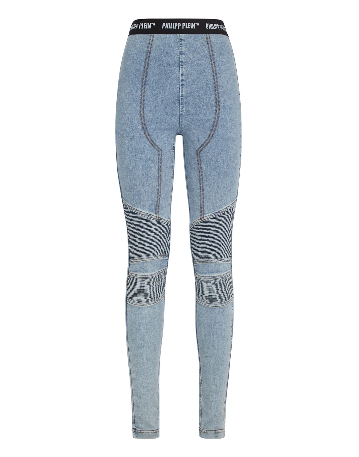 Super stretch stone washed denim jeggings. Geribbelde inzetstukken. Elastische tailleband met jacquard geweven logo. Stiksels met twee naalden. Pasvorm: Zeer hoge taille.