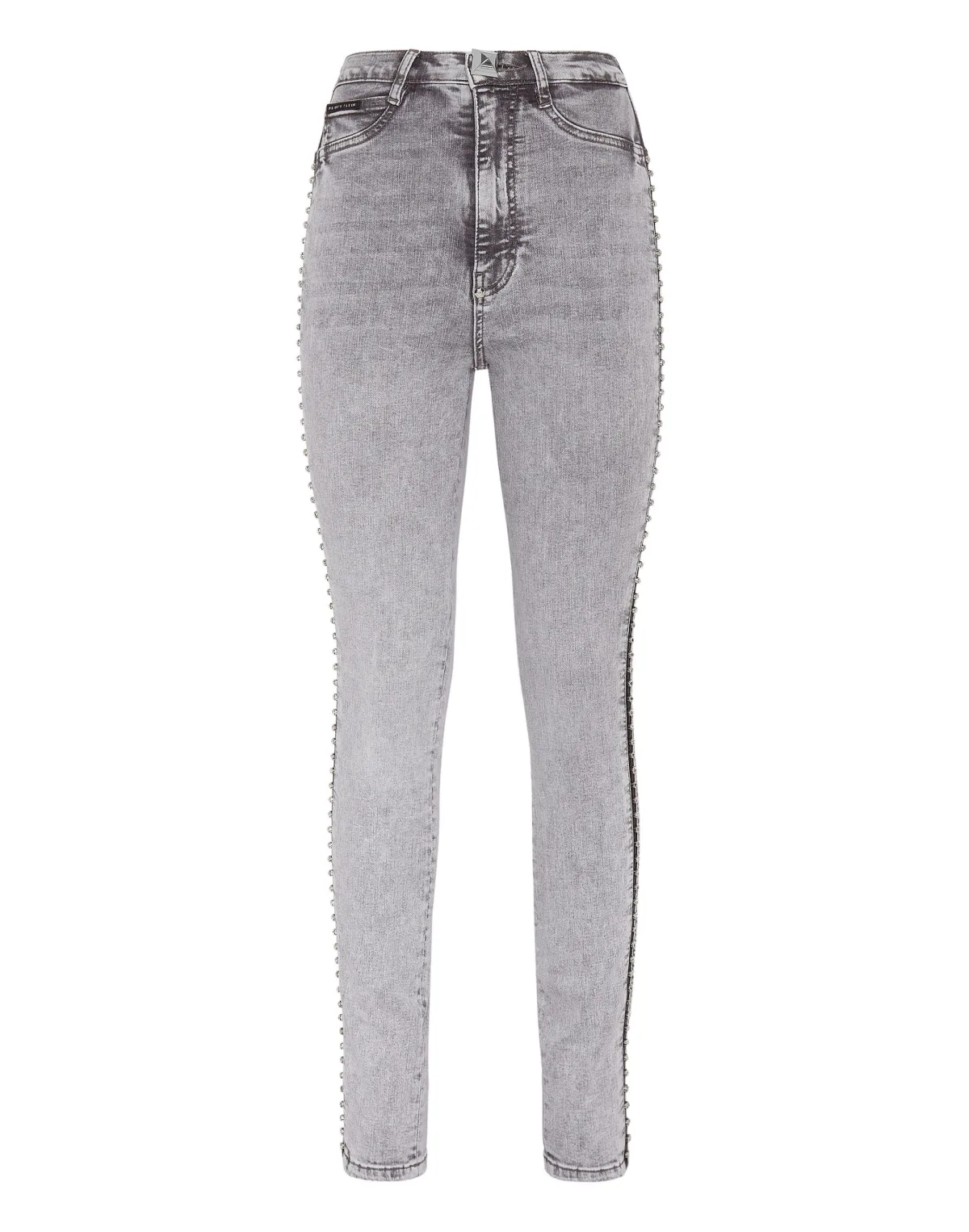 Verfraaid Super stretch stone washed denim 5 pocket jeggings met leren inzetstukken en strass-steentjes. Enkele metalen knoopsluiting. Ruw gesneden onderkant. Pasvorm: Palace.