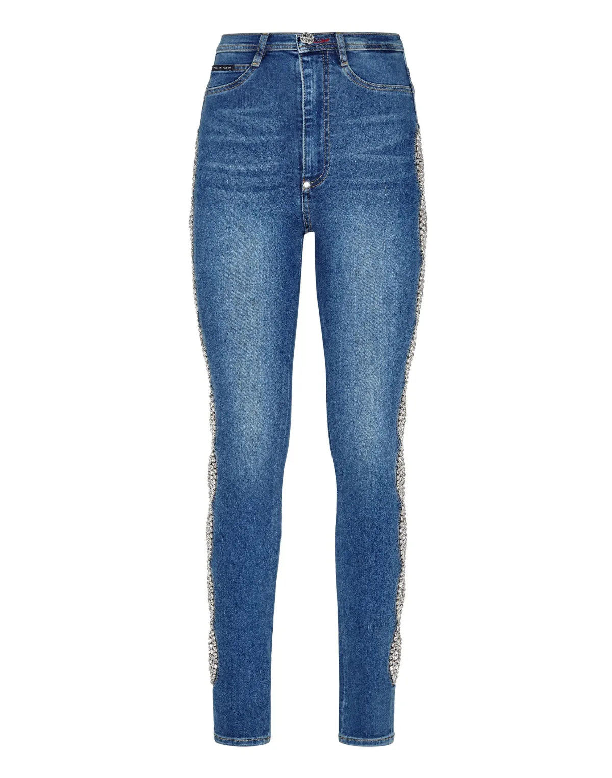 Verfraaid Stretch stone washed denim 5 pocket jeggings met strasapplicaties op de buitenste naad. Enkele metalen knoopsluiting. Het merklabel is achterop de tailleband genaaid. Onderkant: 28 cm. Pasvorm: Zeer hoge taille.