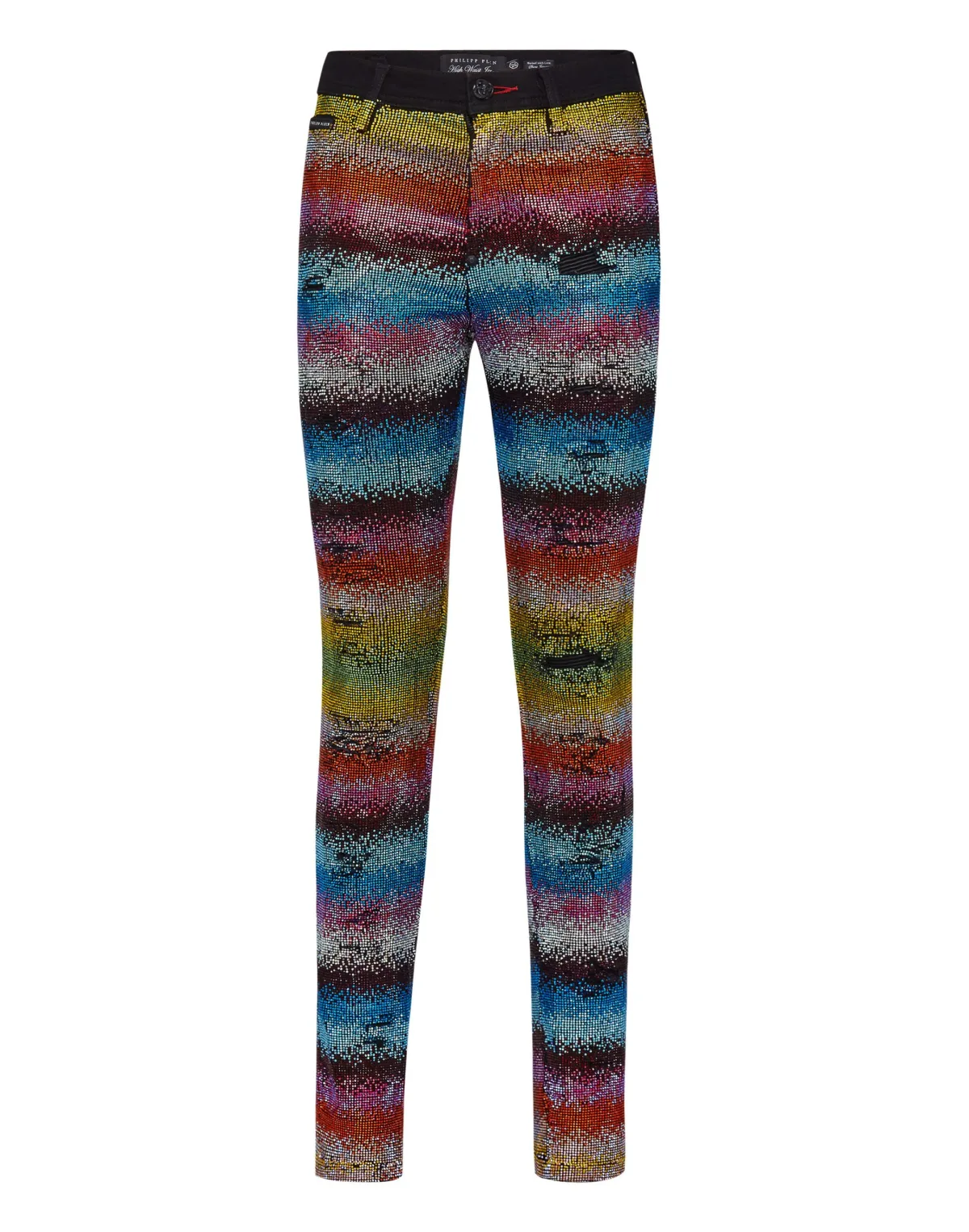 Verfraaid Deze nauwsluitende stretch stone washed en distressed denim jeggings met hoge taille en 5 zakken hebben strass-applicaties met een regenboogeffect. Het iconische hexagonale logo is genaaid op de rechterachterzak. Enkele metalen knoopsluiting. Onderkant: 28 cm.