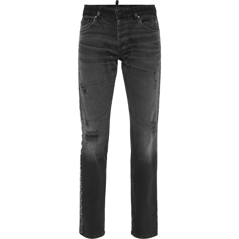 Vergeet de routine en kies voor iets totaal origineels zoals deze jeans met een sterk karakter. Gebruikt effect denim Grosgrain banden met studs applicaties Enkele metalen knoop Opgenaaide patch met logo op de rechter achterzak Pasvorm: Super recht