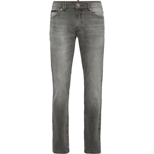 Het basismodel van de 5-pocket jeans wordt gekenmerkt door de Plein-stijl. Ontdek elk detail. Steengewassen denim 3D-borduursel op de achterkant Opgenaaide patch met logo op de achterkant Enkele metalen knoop Pasvorm: Super recht