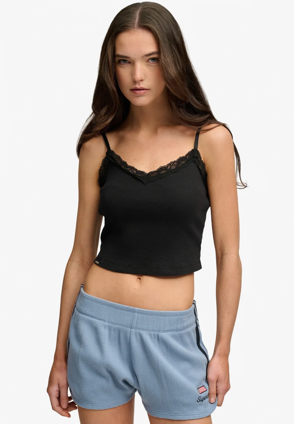Design: Gevoerde zoom/rand; Materiaal: Jersey; Halstype: V-hals; Motief: Effen; Soort bandjes: Spaghettibandjes; Details: Kant; Extra's: Verstelbare bandjes; Pasvorm: Slanke pasvorm; Armlengte: Mouwloos; Lengte: Korte pasvorm