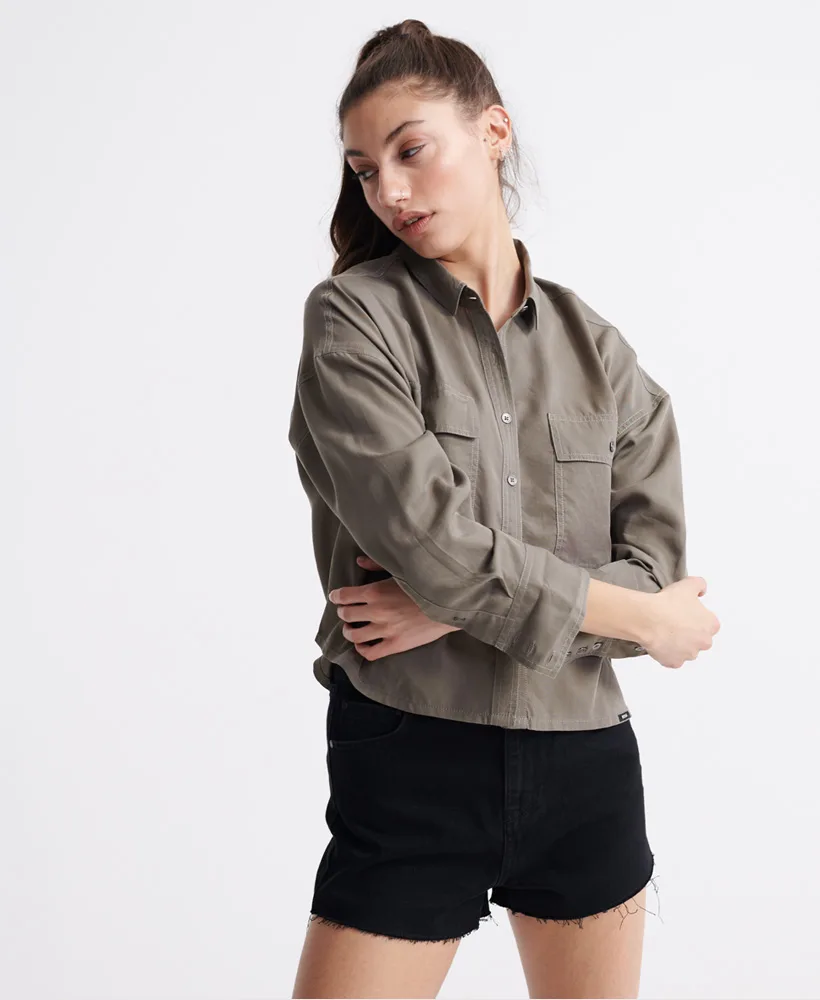 Superdry Desert oversized overshirt voor dames. Het korte overshirt heeft een oversized bies, lange mouwen, een geknoopte kraag, een puntkraag, een geknoopte manchet en twee borsteljasjes. Bewerkt met een klein metalen Superdry-logolabel in de zakken en een Superdry-logolabel in de zoom.