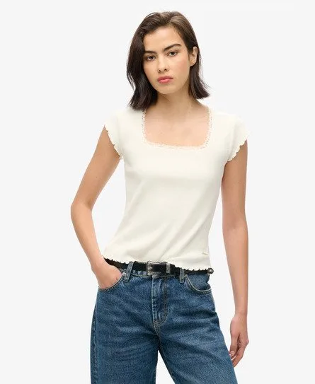 Geef je look een authentieke touch met ons Essential-T-shirt met vierkante hals. Deze verfijnde top is een gemakkelijke manier om je outfits naar een hoger niveau te tillen. Kies voor casual-chic, of je het shirt nu in laagjes draagt of een subtiel statement maakt. Slimfit - de nauw aansluitende pasvorm zorgt voor een getailleerd silhouet Geribd materiaal Kanten biezen Korte mouwen Geborduurd Superdry-logo UK 6-8, VS 2-4, EU 34-36 VK 10-12, VS 6-8, EU 38-40 VK 14-16, VS 10-12, EU 42-44