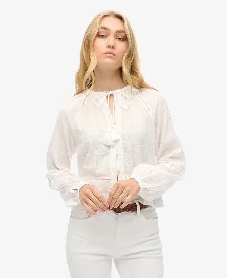 Geef je look een vleugje bohemian chic met ons katoenen strandtopje. Deze lichtgewicht top is ideaal om je te bedekken en tegelijkertijd koel te houden. De top heeft een ambachtelijke look om je zorgvuldig samengestelde outfit naar een hoger niveau te tillen. Losse pasvorm - cool en comfortabel komen samen in een stijlvolle losse pasvorm die je gewoon moet hebben Broderie-details Kanten inzetstukken Kraag met trekkoord en kwastjes Knoopsluiting Raglanmouwen Manchetten met knopen Metalen Superdry