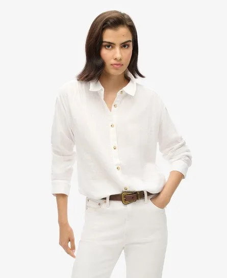 Ons lange strandoverhemd is de perfecte zomerklassieker om je strandlook naar een hoger niveau te tillen, zodat je er op die zonnige dagen moeiteloos chic uitziet. Dit overhemd is lekker ruim en licht - de perfecte optie om over je bikini te dragen of om te combineren met een spijkershort om je authentieke zomerse stijl te showen. Enkele kraag Knoopsluiting Lange mouwen Manchetten met knopen Metalen knooplogo op de zoom Superdry-logolabel op de achterkant