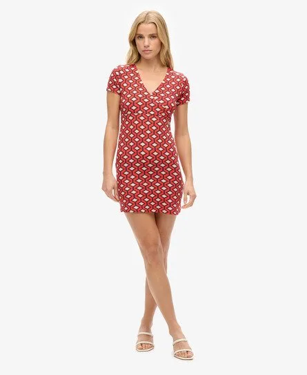 Een vintage wikkeljurk is een tijdloze en betrouwbare manier om elegantie aan je dagelijkse kleding te geven. Dit zachte vintage kledingstuk heeft een prachtig patroon dat gegarandeerd opvalt en je garderobe fris en authentiek houdt, maar vooral zorgt voor comfort. Slimfit - de nauw aansluitende pasvorm zorgt voor een getailleerde look V-hals Korte mouwen All-overprint Geborduurd Superdry-logo