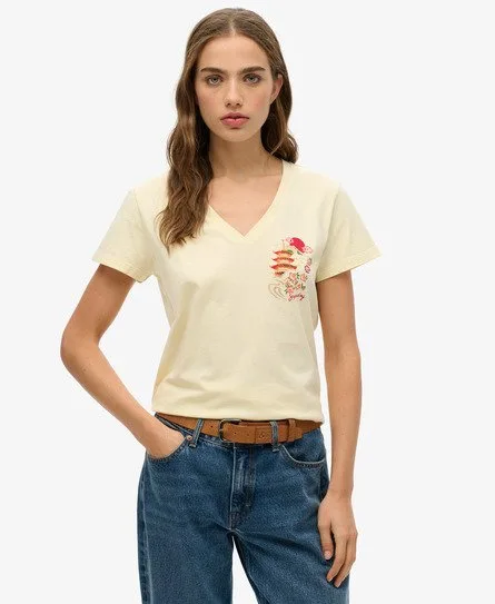 Superdry Vrouwen Suika Metallic Relaxed T-shirt met V-hals Crème