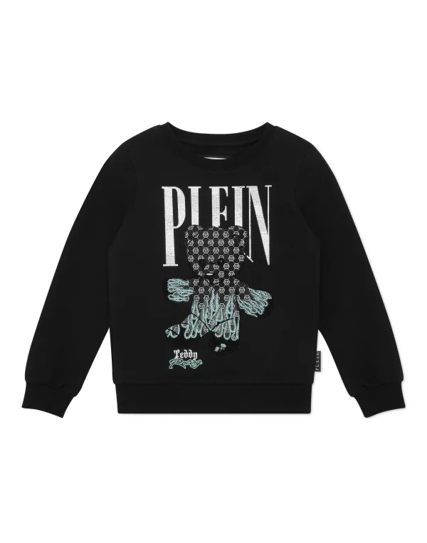 Speels ontmoet iconisch in dit sweatshirt met ronde hals, waar gewaagde Plein letters en sprankelende teddybeer graphics zorgen voor een opvallende look met alledaags comfort. Stijl met een cargobroek of joggingbroek voor moeiteloze coolheid Teddybeer en logo-ontwerp zorgen voor kenmerkende attitude Strass-versieringen zorgen voor een luxe, glinsterende afwerking Zachte katoenmix met stretch voor comfort en beweging Een perfect laagjesstuk voor gedurfde, casual dagen