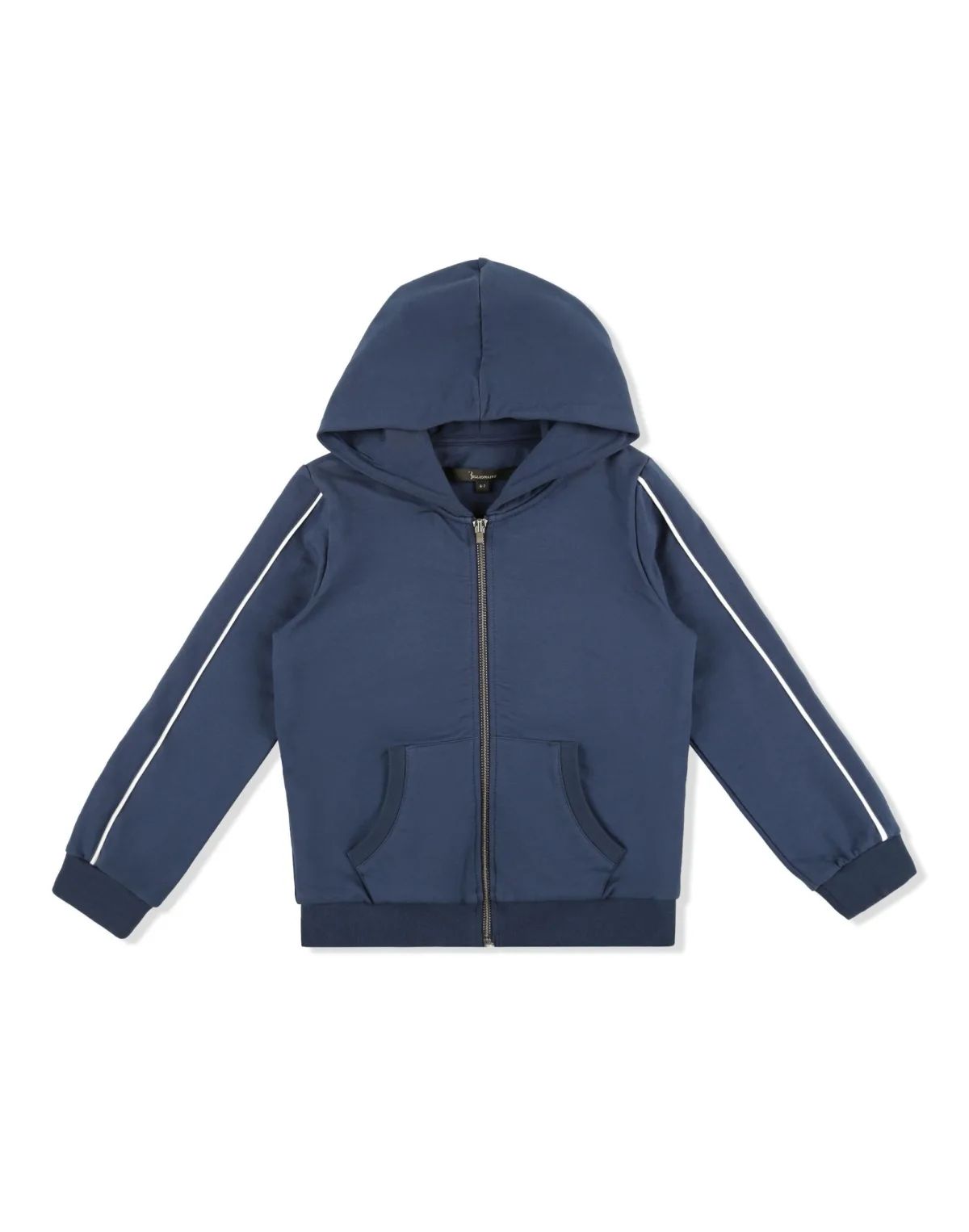 The coat of arms is common trait of a special family. On this cotton fleece hooded sweatjacket it is featured on the back. Contrasting piping give the item a sportier look. Cotton jersey lining for the hood. Zipper fastening and two slit pockets. Ribbed cuffs and bottom hem.