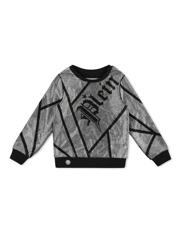 This cotton fleece crewneck sweatshirt is covered in crystals and the gothic-styled "Plein" stands out from several graphic signs. Ribbed hems.