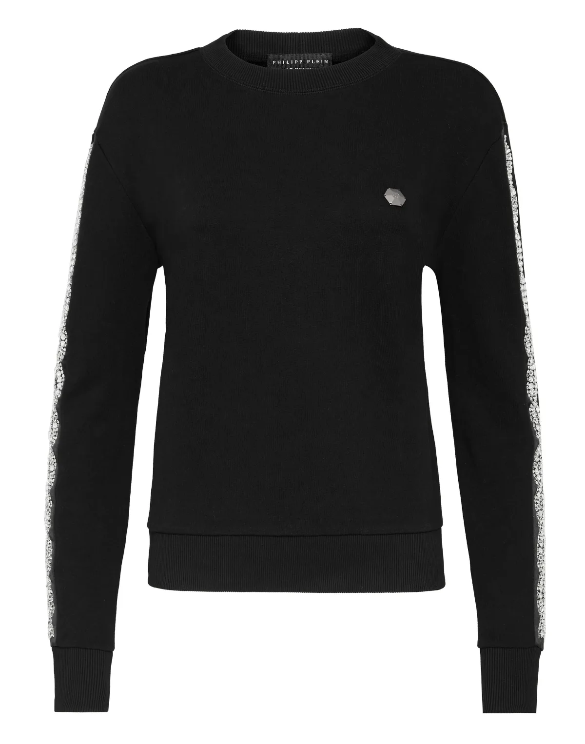 Verfraaid De iconografie van Philipp Plein wordt geïdentificeerd met "glanzende" graphics. Deze katoenen fleece hoodie heeft strepen met strass- en bezelversieringen op beide mouwen. Geribde manchetten en onderkant.