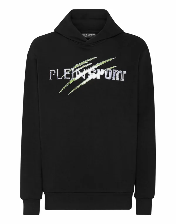Personalize your active time with this fleece hoodie. A few graphic elements are all it takes to define the style of Plein Sport. See what we’ve created for this season. Cotton fleece with gauzed lining The iconic Tiger Scratch print is featured inside a foil-print artwork Rubberized patch sewn atop hood Two slit pockets Rib knit hems