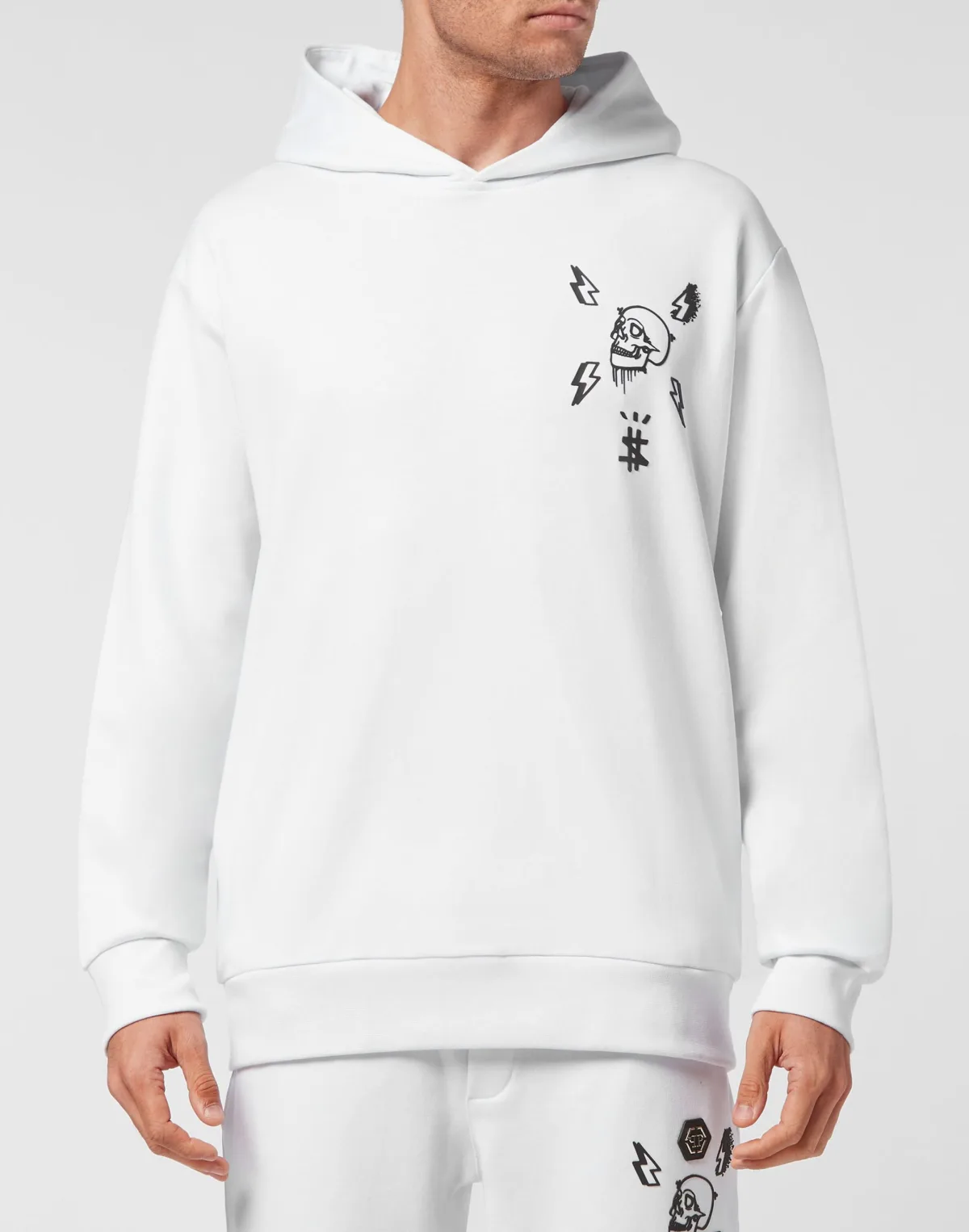 Katoenen fleece hoodie met de iconische symbolen van het merk op de voor- en achterkant. Buidelzak. Ribgebreide manchetten en onderkant.
