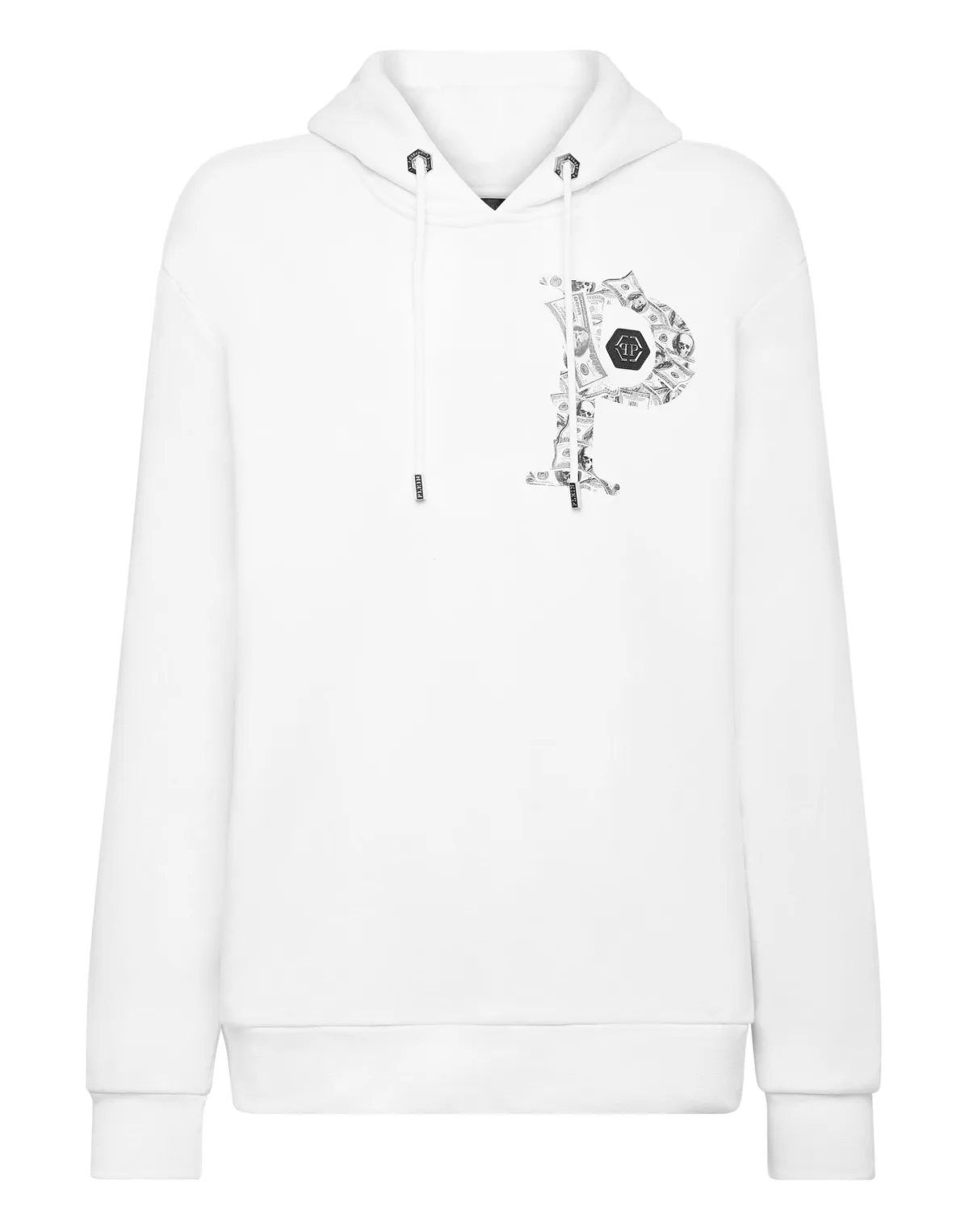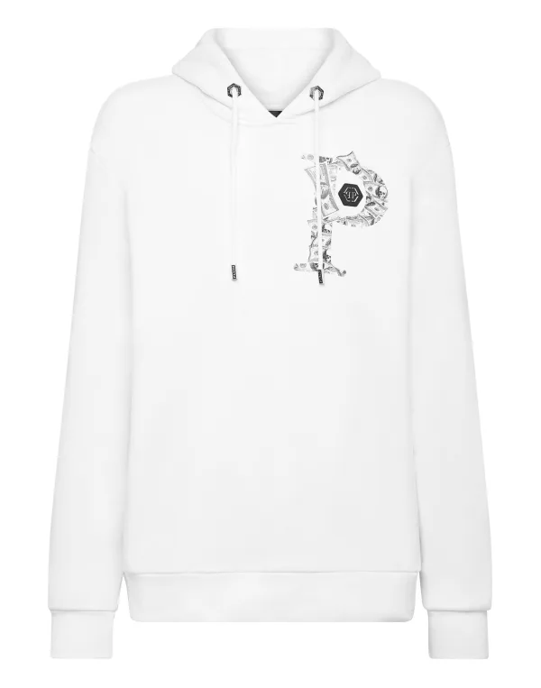 Katoenen fleece hoodie met prints met het thema "Money". Saffiaans lederen PP Hexagon is genaaid op de linkerborst en een metalen ophanglus met logo zit aan de bovenkant van de capuchon. Buidelzak. Ribgebreide manchetten en onderkant.