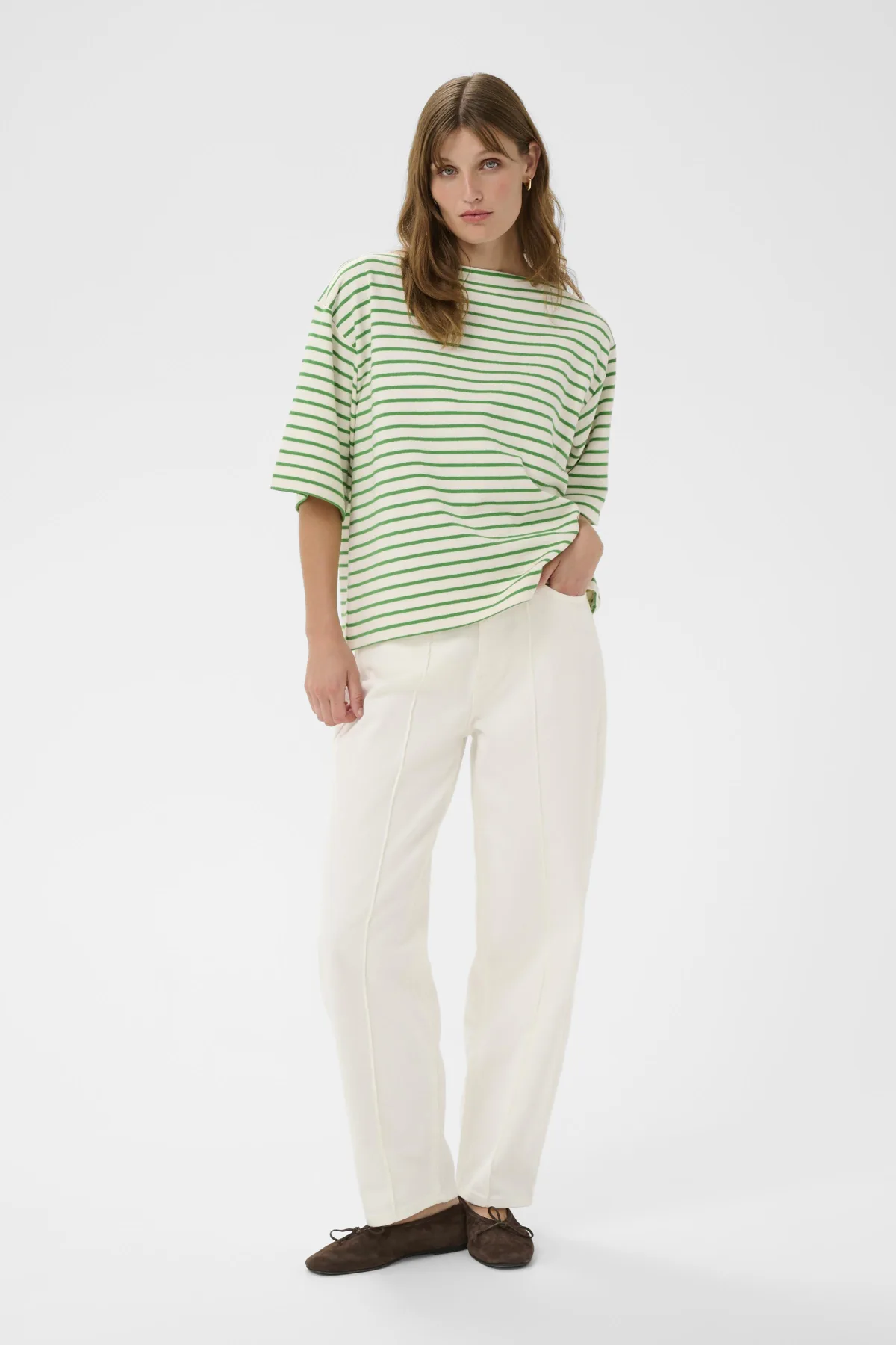 Gestreept T-shirt met een rechte en vierkante snit en driekwartmouwen. Heeft een brede bootkraag en een zachte, textuurlijke afwerking voor een casual look.