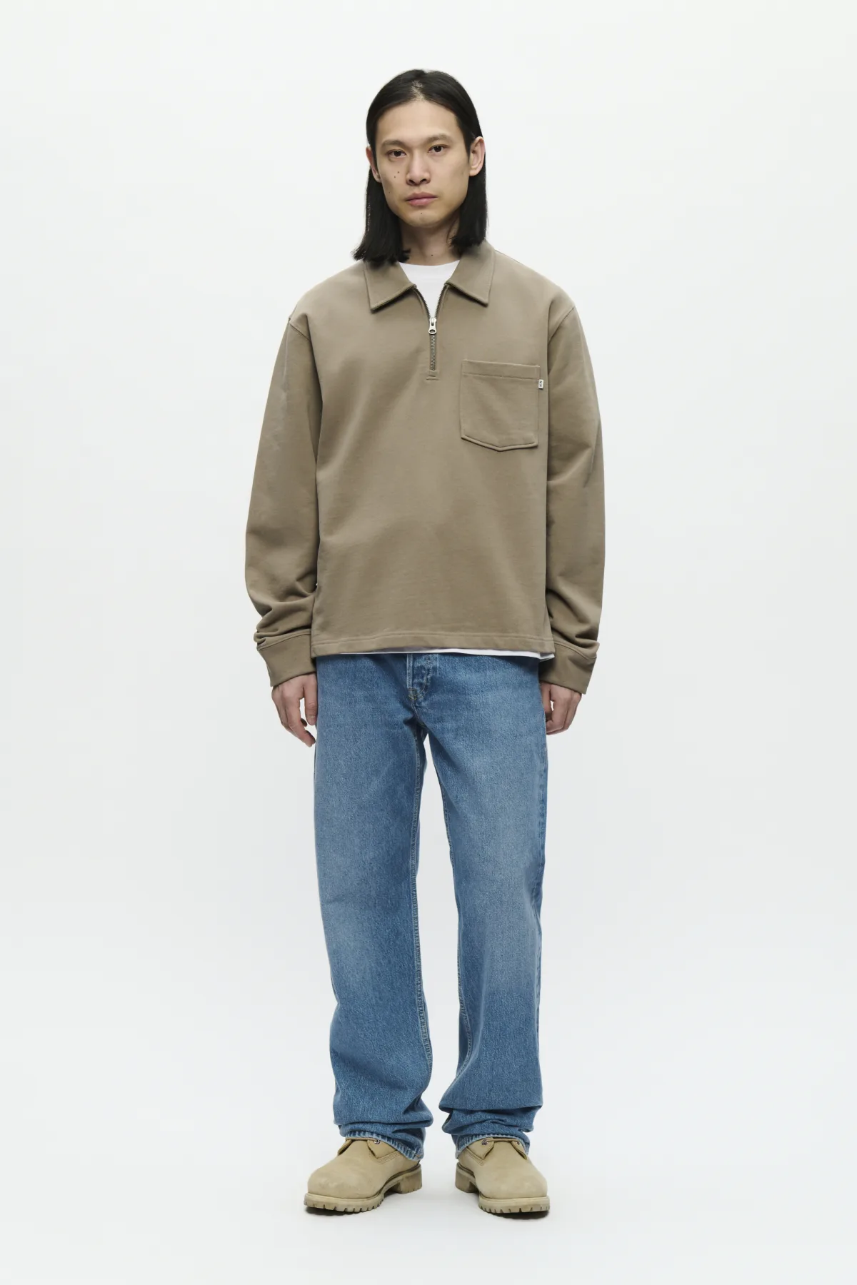 Herenshirt met lange mouwen, comfortabele rechte pasvorm en klassieke kraag met halve rits. Borstzak en minimalistische uitstraling maken het geschikt voor dagelijks gebruik.