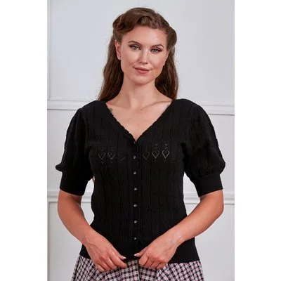 “All wrapped in love.” Deze cute cardigan is een echte must-have voor je garderobe. Uitgevoerd in zachte, fijngebreide 100% katoen in tijdloos zwart en afgewerkt met een opengewerkt hartjespatroon en speelse geschulpte biesjes. * V-halslijn * Geschulpte biezen * Knopenrij * Stretchy ribboorden