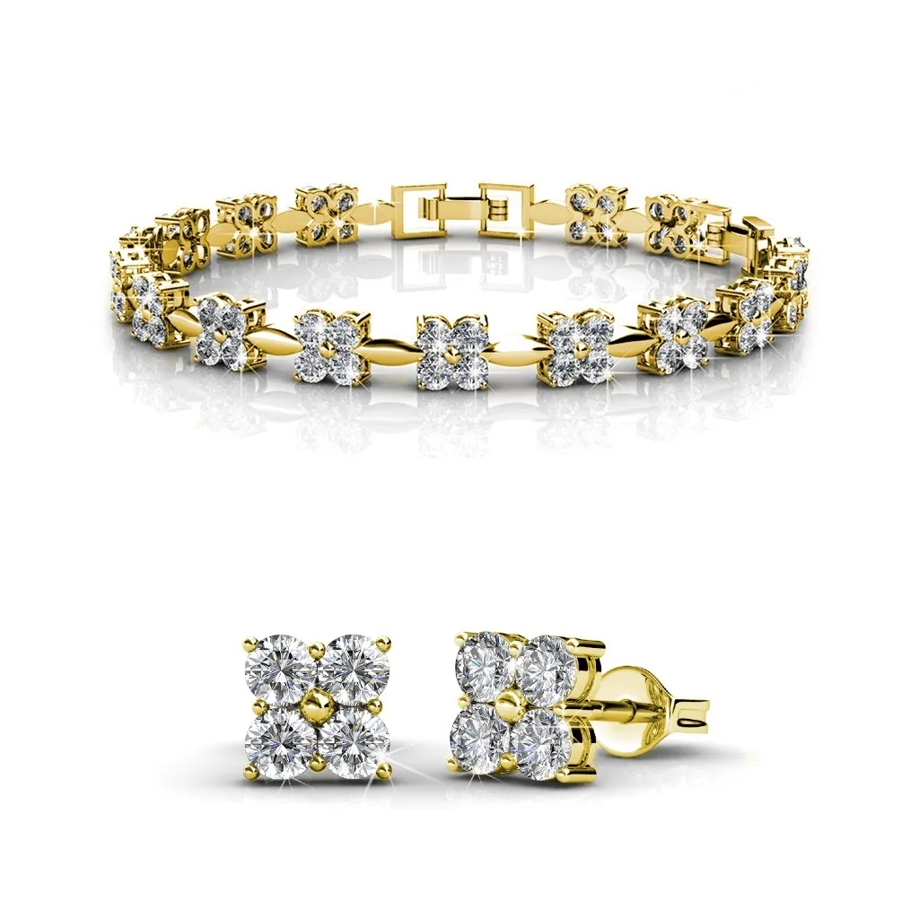 Samenstelling: Messing Afwerking: 18k verguld Steensoort: Oostenrijks kristal Aantal stenen (stuks): 84 Steenkleur: Kristal Armbandlengte (mm): 161 + 20 Oorbellenlengte (mm): 7 x 7