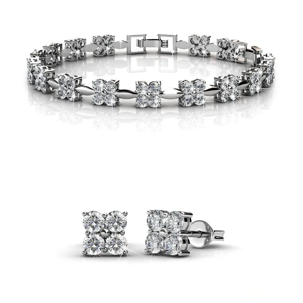 Samenstelling: Messing Afwerking: Rhodium Plated Steensoort: Oostenrijks kristal Aantal stenen (st.): 84 Steenkleur: Kristal Armbandlengte (mm): 161 + 20 Oorbellenlengte (mm): 7 x 7