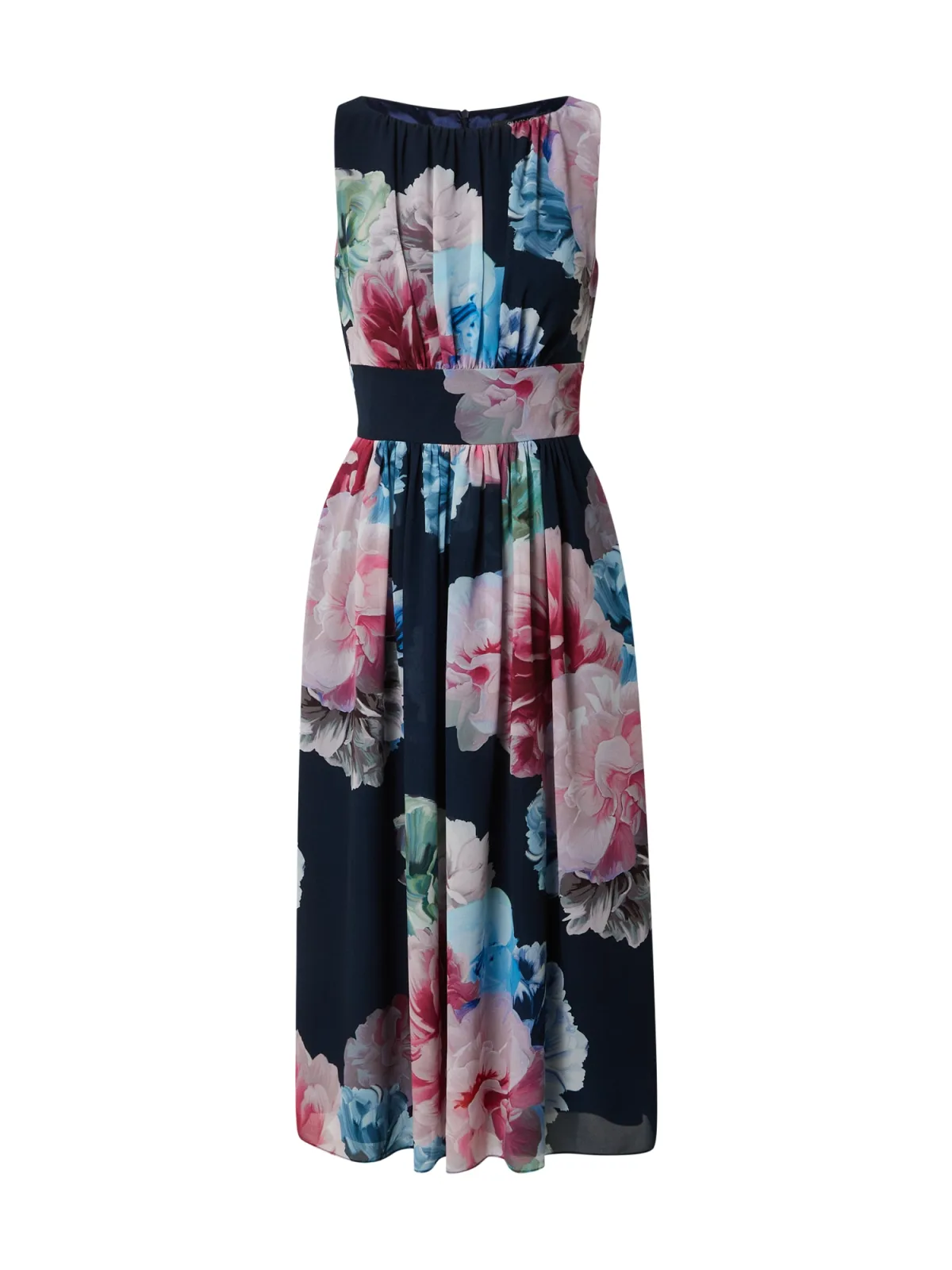 Design: Gevoerde zoom/rand, Flare, Rug rits; Halstype: Ronde hals; Motief: Bloemenprint; Soort bandjes: Brede bandjes; Details: Plooien, Gedrapeerd; Extra's: All-over patroon, Lichte stof; Lengte: 3/4 lengte; Pasvorm: Normale pasvorm; Armlengte: Mouwloos