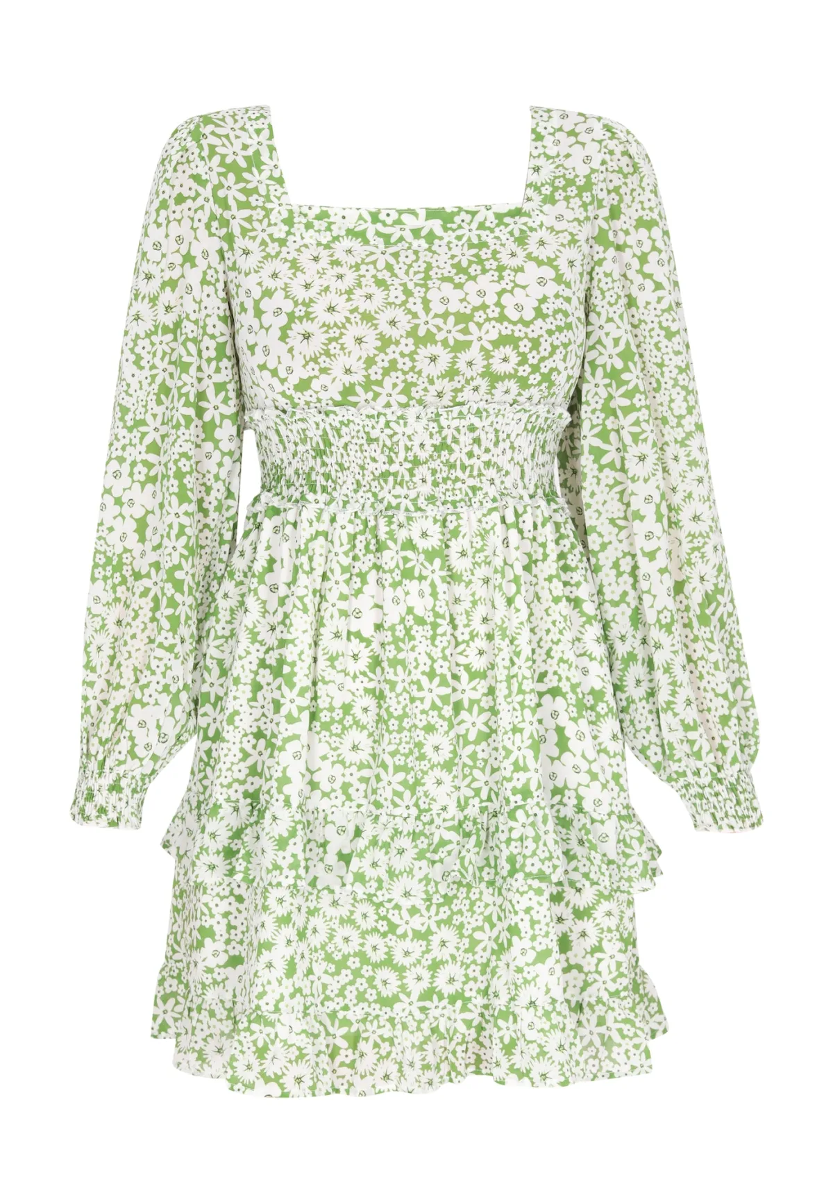 Design: Gevoerde zoom/rand, Om te knopen/binden; Halstype: Carréhals; Motief: Bloemenprint; Details: Cut-outs, Ruches, Gedrapeerd; Extra's: All-over patroon, Gladde stof; Lengte: Kort/mini; Snit: Getailleerd; Pasvorm: Slanke pasvorm; Armlengte: Lange mouw