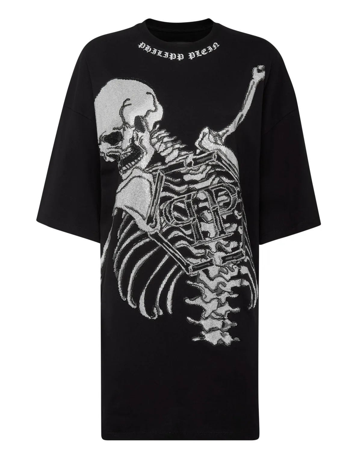 Verfraaid T-shirtjurk van katoenen jersey met strassteentjes en Skeletprint op de voorkant: - Materiaal: Zachte katoenen jersey voor een comfortabele pasvorm. - Design: Opvallende Skeletprint, geaccentueerd met strassteentjes voor een vleugje glamour. - Details: Een saffiaanleren patch met de PP Hexagon minutieus op het kruis genaaid. - Stiksel: Tweenaalds stiksels zorgen voor duurzaamheid en een gepolijste afwerking. - Limited Edition: Dit stuk maakt deel uit van een limited edition-collectie, waardoor het een unieke toevoeging aan je garderobe is.