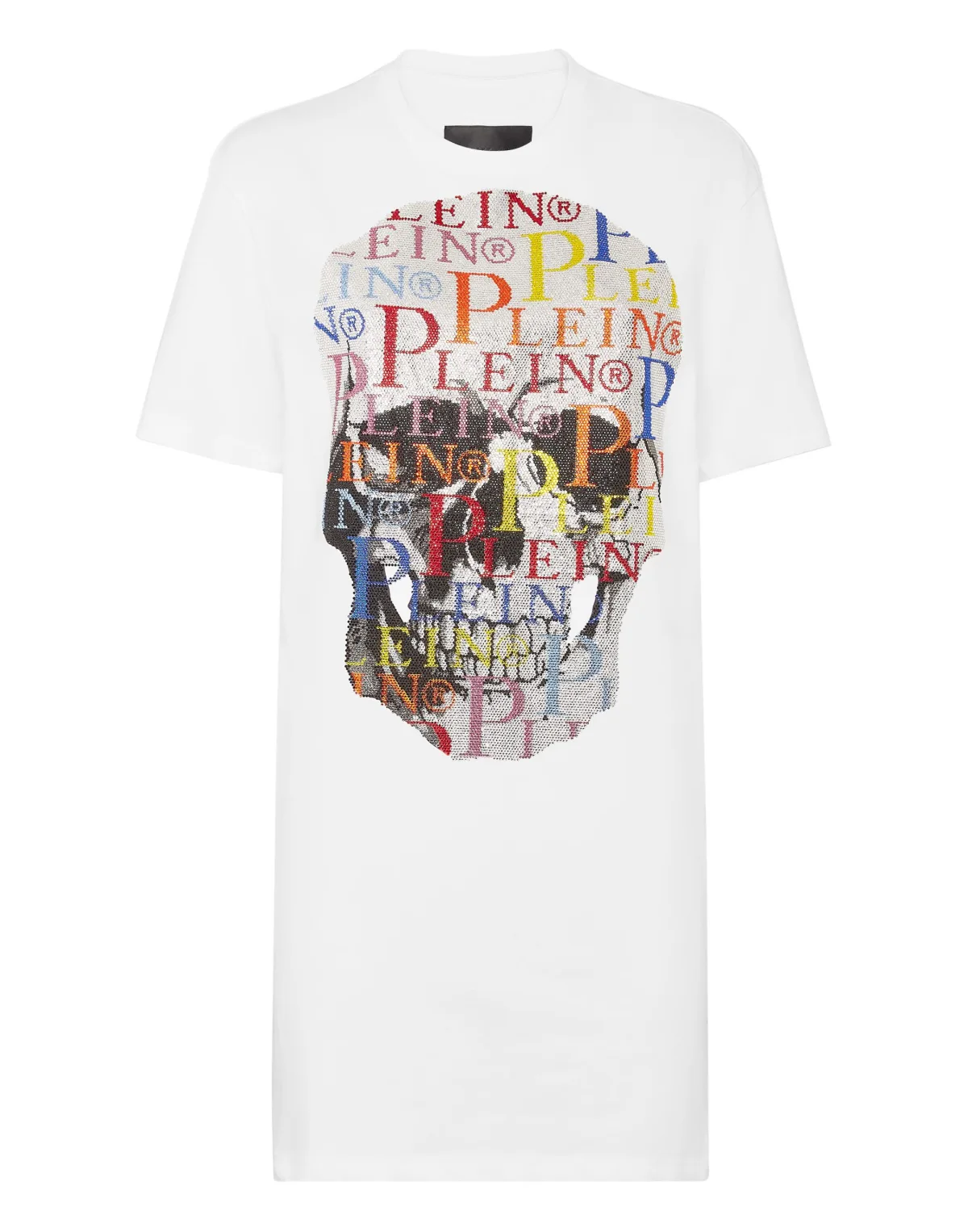 Katoenen T-shirtjurk van jersey met de iconische doodskop met strass-print. Een saffiaanleren patch met de PP Hexagon op het juk genaaid. Zomen gestikt met twee naalden.